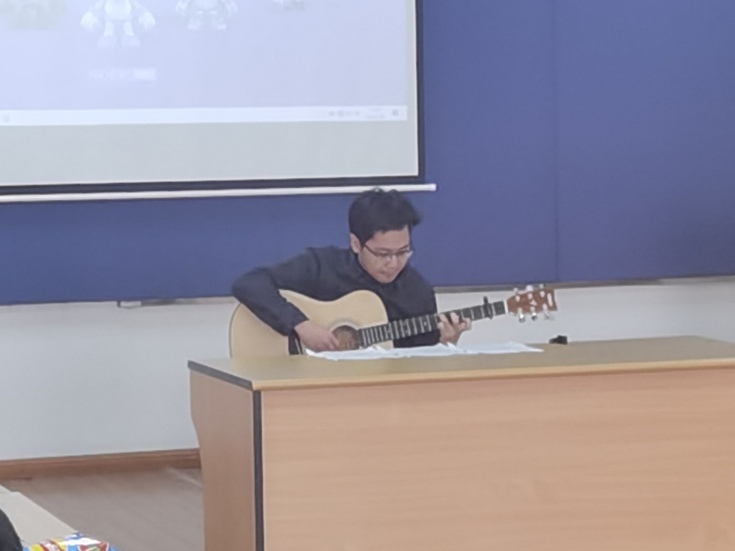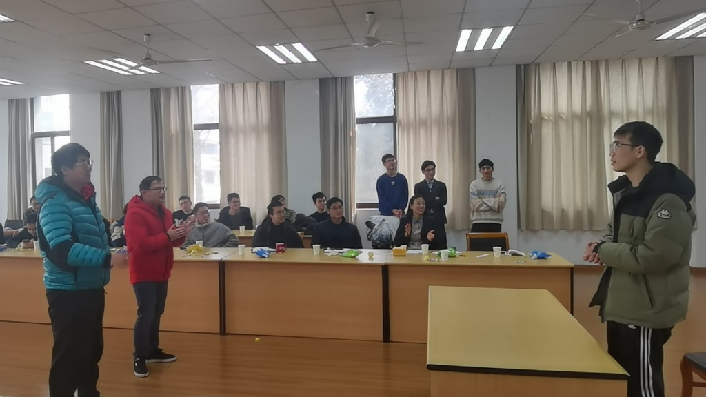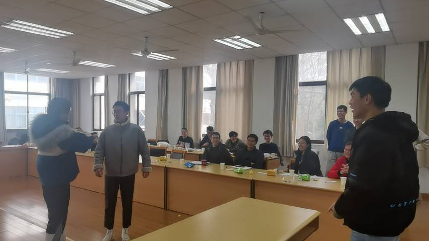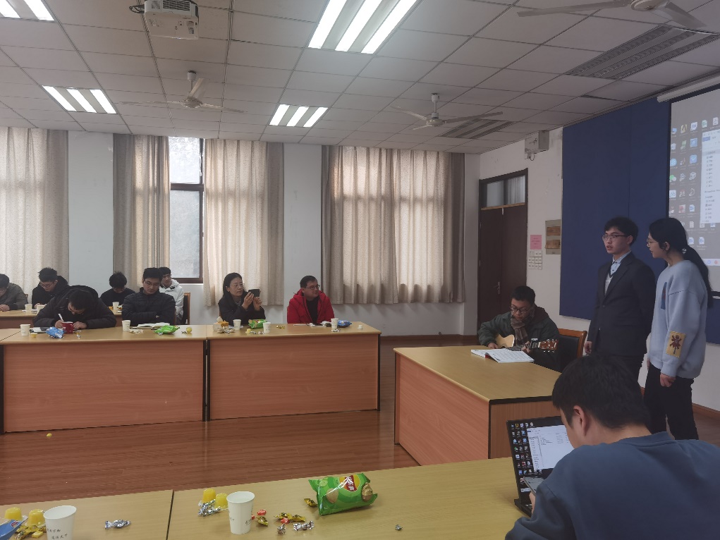 在汇报结束后,为迎接2022年,老师和同学们还举行了联欢会,主要节目有古琴独奏、指弹、弹唱、配音、合唱、配音等。在节目中还穿插了抢板凳、猜字谜、猜词等小游戏,老师学生都积极参与。最后,教研室全体成员举行了聚餐。聚餐后,周瑾老师发表了讲话,鼓励大家在以后的科研或者工作中要继续努力,不轻易放弃。