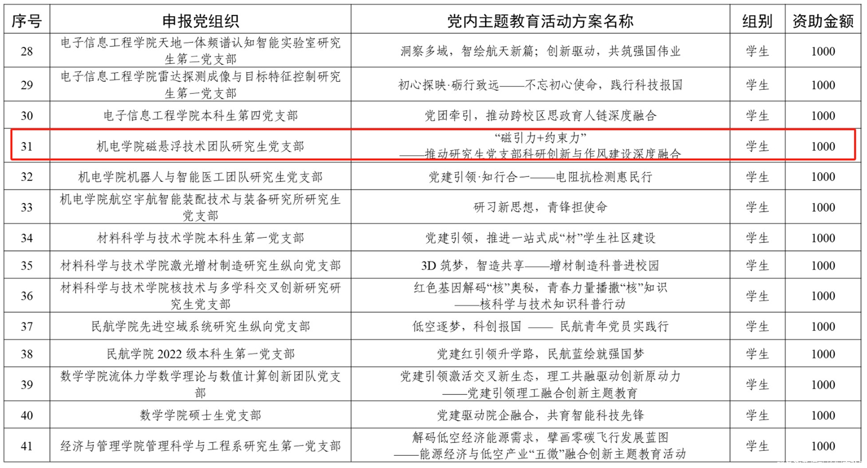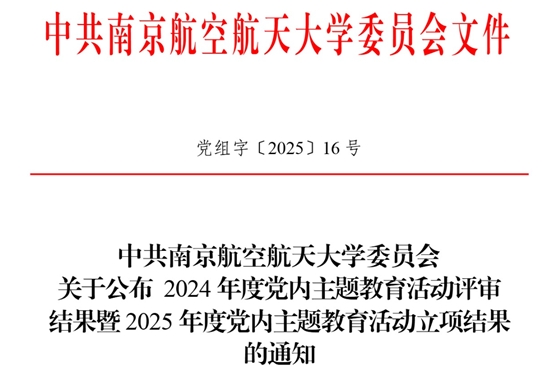 近日,中共南京航空航天大学委员会公布了2025年度党内主题教育活动立项结果,经过基层党组织积极申报、学校评审、校内公示,磁悬浮技术团队研究生党支部申报的《“磁引力+约束力”——推动研究生党支部科研创新与作风建设深度融合》顺利获批校级党日主题教育活动立项。