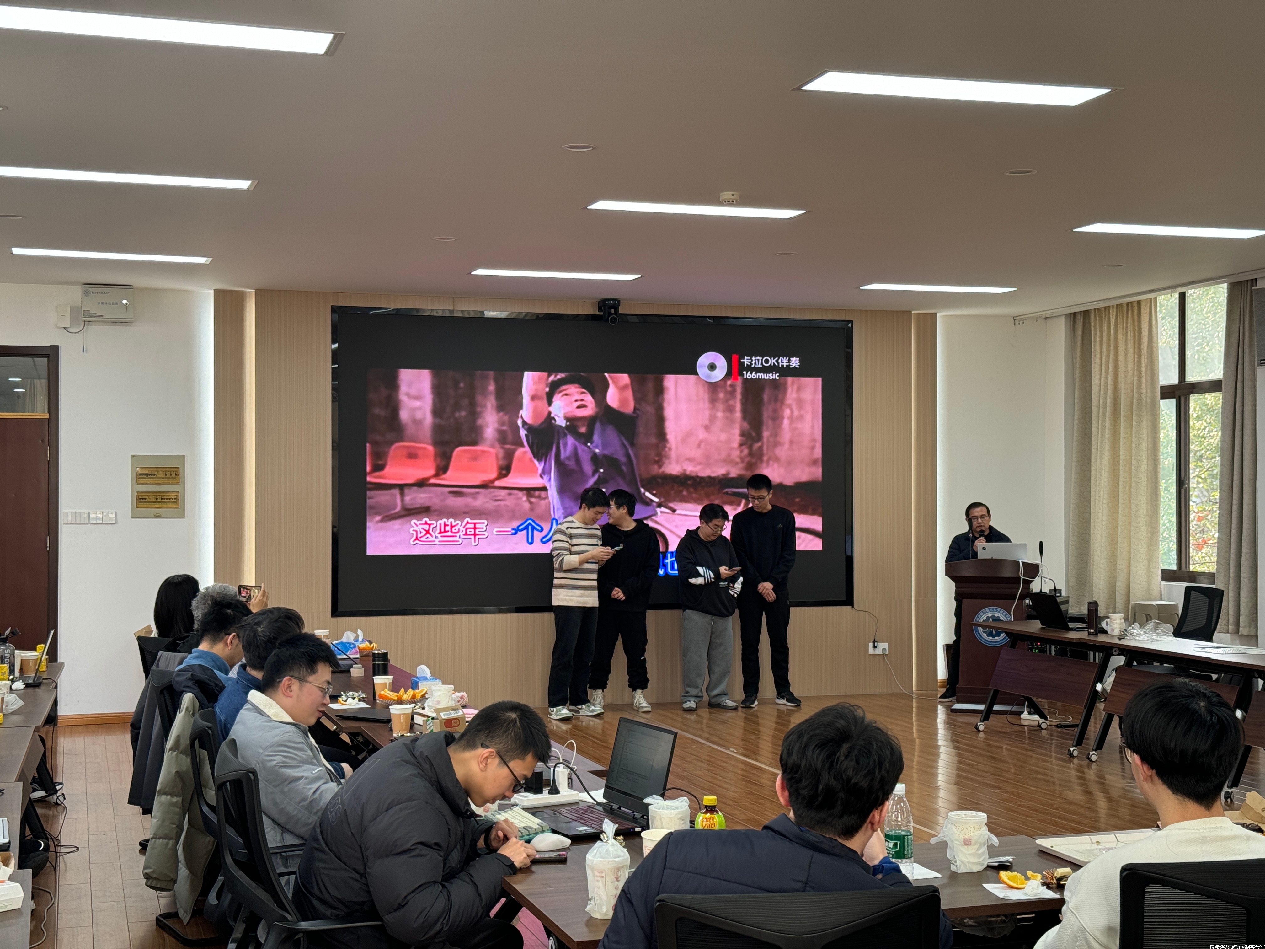 随后,元旦联欢活动在欢乐的氛围中展开。现场安排了丰富多彩的文艺节目与互动环节,节日气氛热烈。多位研一同学献上了《朋友》《水手》《他夏了夏天》《稻香》等经典歌曲的精彩合唱。为促进团队协作,活动还设计了抢凳子、你划我猜、选logo等趣味团体游戏,大家积极参与,Jarir Mahfoud教授也融入其中,游戏过程中笑声不断、智慧碰撞。临近尾声,金老师演绎的《过火》与王泽宇同学演唱的《大人中》赢得了阵阵掌声,将气氛推向高潮。