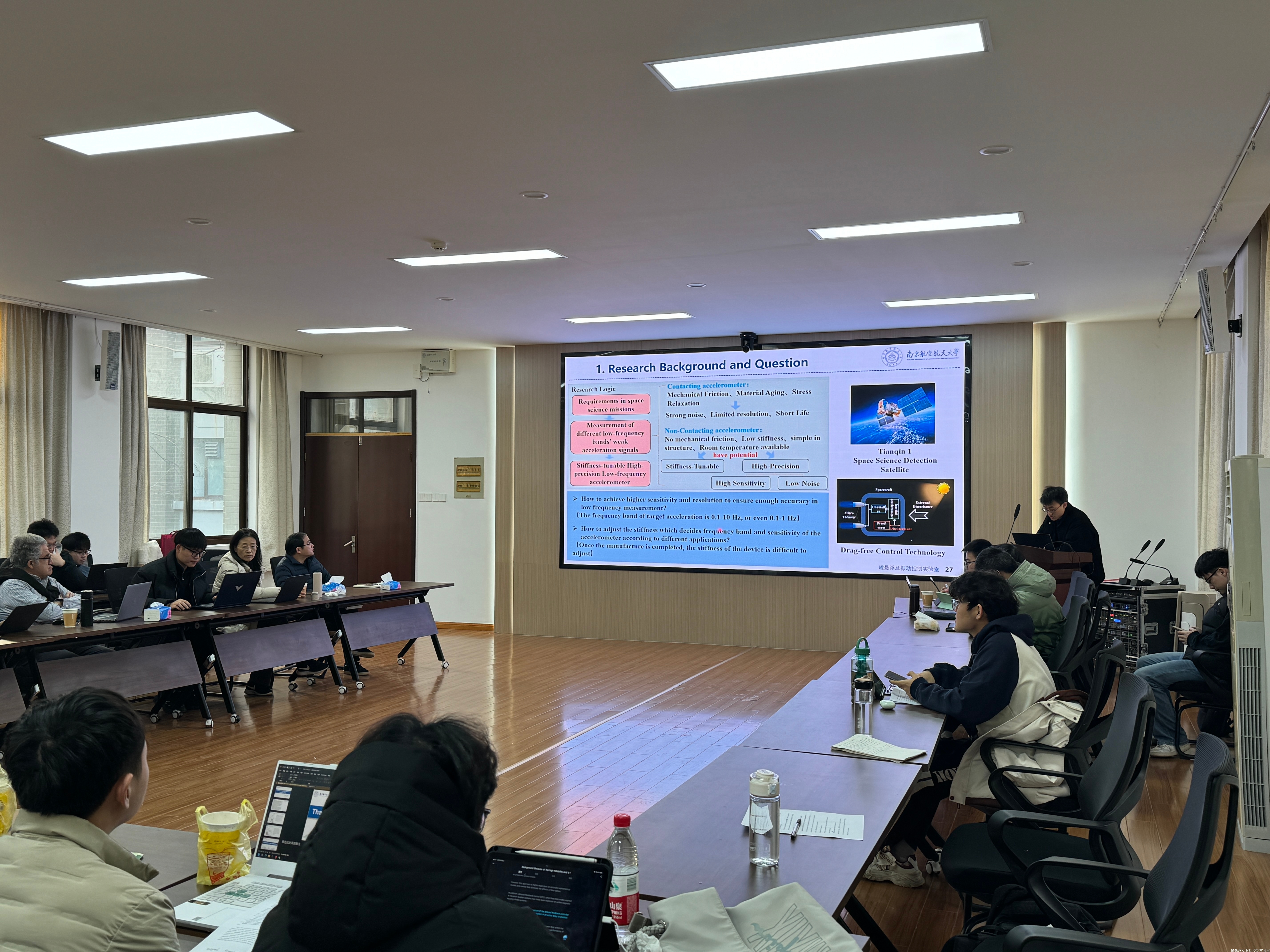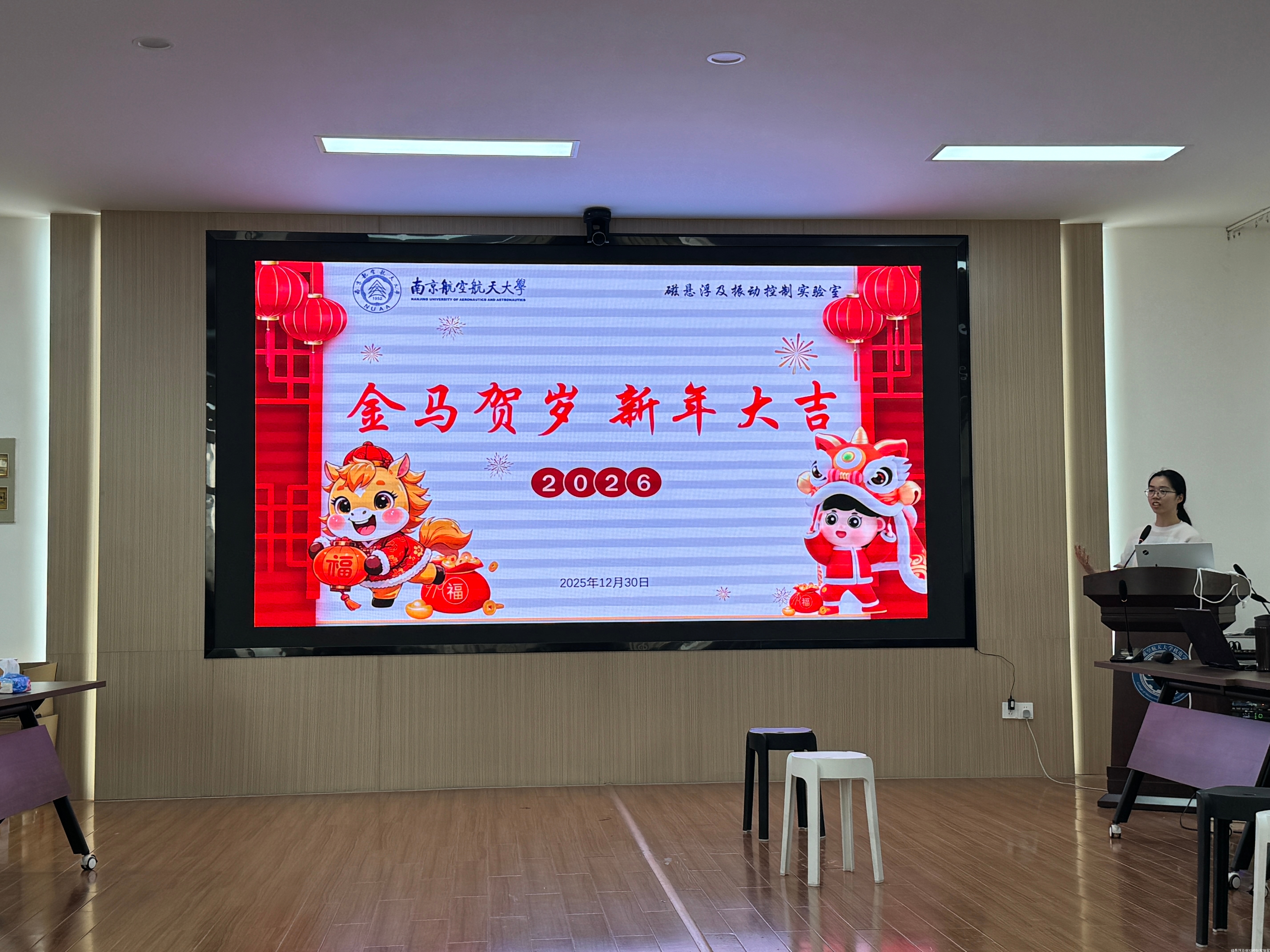 2025年12月30日,南京航空航天大学磁悬浮及振动控制实验室于A6-6201成功举办了英语创新七问汇报活动暨元旦联欢会。本次活动旨在系统梳理课题创新成果,明确新一年的科研与学习目标,并进一步加强团队成员间的协作与情谊。活动首环节为“英语创新七问汇报”,实验室成员以英语形式展示各自课题的创新思路与研究进展,并与在场教研室老师及法国国立应用科学学院(INSA Lyon)Jarir Mahfoud教授展开了深入探讨与交流。通过这一环节,同学们不仅锻炼了英语表达与学术汇报能力,也对科研创新的全过程有了更深的理解与体认。