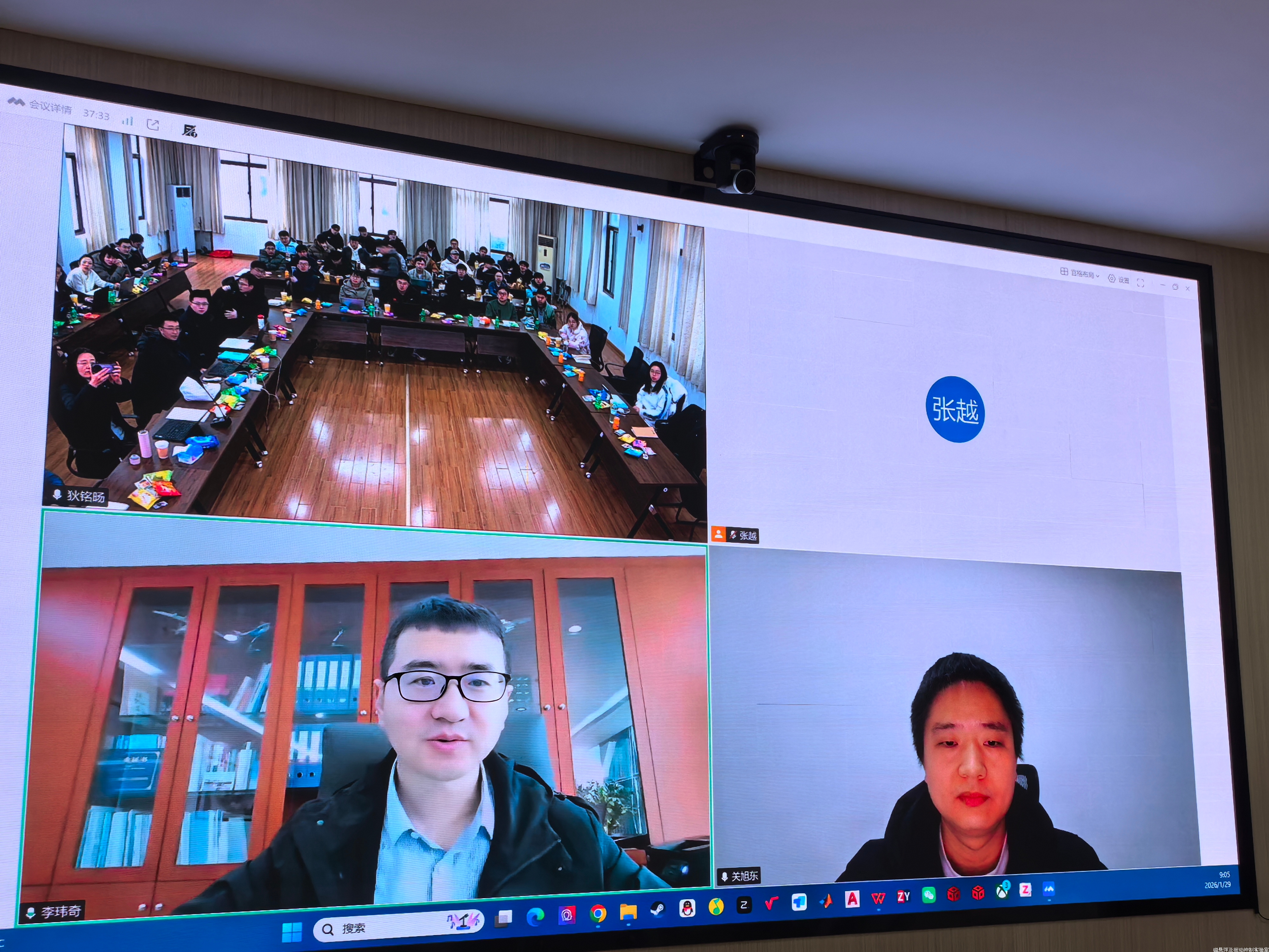 会议伊始,实验室新晋研究生朱俊同博士登台进行自我介绍。随后,优秀毕业生李玮奇(深圳市南航电子董事长)和关旭东(常州大学副教授)以线上形式向全体实验室成员送上了新年祝福并分享了宝贵经验。李玮奇提醒大家“捷径往往不是捷径,可能是更远的路”,鼓励大家夯实基础,脚踏实地开展科研学习;关旭东则结合“两万小时法则”,阐述了持续积累对于个人成长的重要意义。