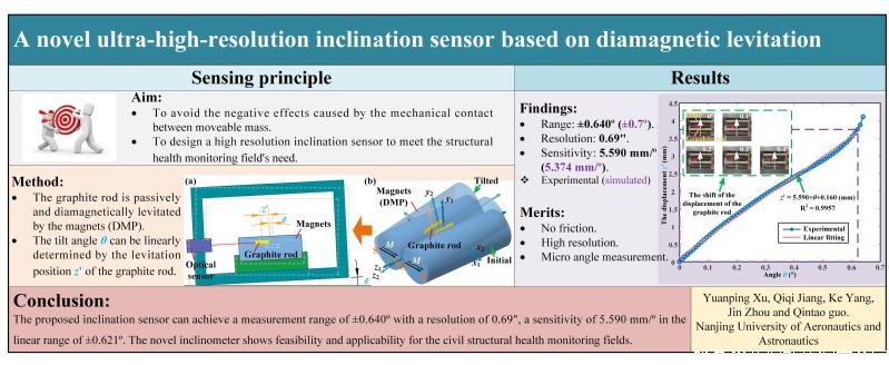 抗磁悬浮技术作为一种无需外界能量输入即可实现物质常温被动稳定悬浮的技术凭借其高灵敏性的特点引起了国内外众多学者的关注。本课题组本着结构健康监测等特殊领域对高分辨率倾角传感器需求出发,针对高分辨率高精度抗磁悬浮倾角传感器的设计研究已开展了相关研究工作,取得了一定的研究成果并以“A Novel High-resolution Inclination Sensor Based on Diamagnetic Levitation”为主题发表于期刊《Sensors and Actuators: A. Physical》2022年8月16日第343卷中(https://doi.org/10.1016/j.sna.2022.113686)。课题组周瑾教授为本文的通讯作者,徐园平副教授为本文的第一作者,硕士研究生江琦琦、本科毕业生杨科及郭勤涛副教授分别作为本文的第二、三、五作者,南京航空航天大学为第一单位。